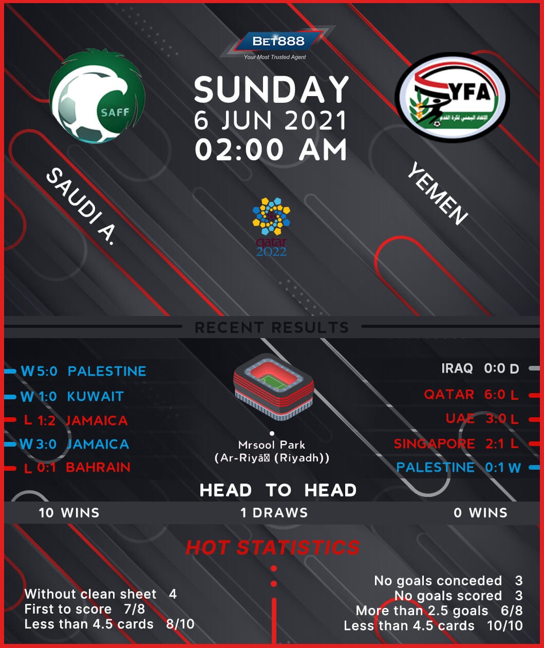 Meanwhile, Yemen have experienced a torrid start to this qualifying series. They’ve failed to win four of their opening five World Cup Qualifying fixtures (D2, L2), barring a narrow 1-0 home triumph against Palestine on Matchday 4. Yet, there’s been plenty of early action in Yemen’s World Cup qualifiers so far, with three of their five such contests producing 2+ first-half goals, including the reverse fixture against Saudi Arabia. Alarmingly, going back to a 2-0 victory against the Maldives back in the 2016 Asian Cup play-offs, the ‘Red Devils’ have gone winless in their subsequent 17 away matches, friendlies included (D5, L12). Moreover, they have failed to score in three of their last four games on foreign soil (D1), losing all applicable contests by an aggregate score of 9-0.