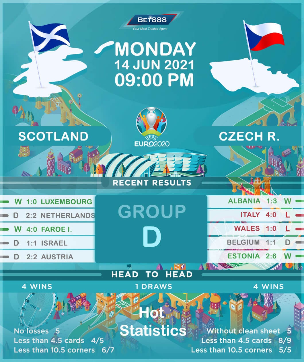 The ‘Tartan Terriers’ have qualified for their 11th major tournament (World Cups and Euros) and their first European Championship finals since 1996 after beating Serbia on a penalty shoot-out in the UEFA Nations League play-off final. Scotland have never managed to make it out of the group stage of any major international competition, having disappointed in their previous two appearances at Euro finals. Scotland’s two victories at the European Championships both came on Matchday 3 when they already lost all chances of reaching the knock-outs. Additionally, they have failed to get on the scoresheet four times in their six matches at the final tournament. On the bright side, though, Steve Clarke’s men have gathered momentum in the build-up to Euro 200, going from back-to-back reverses to five international matches without losing (W2, D3).