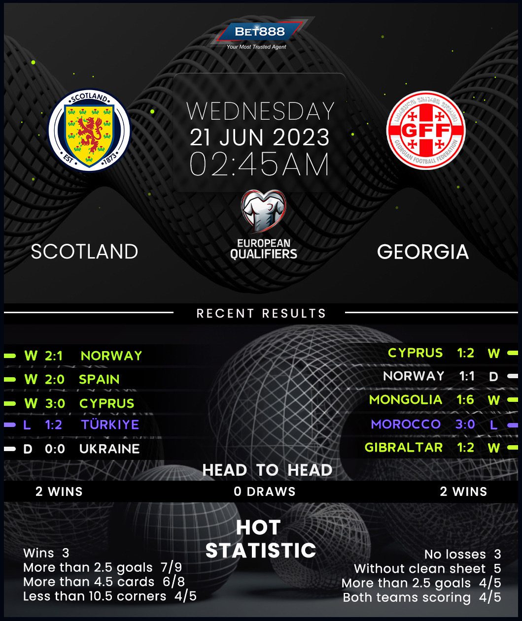 Scotland pulled off a breathtaking last-gasp comeback to defeat Norway 2-1 on the road last time out and maintain an impeccable three-game start to their Group A campaign (W3). Comfortably sat at the top of the table, five points clear of second-placed Georgia, the ‘Tartan Terriers’ could make a vital step towards reaching a second straight European Championship with a win here. Based on their H2H home record, that should be a mere formality, with Scotland winning both previous home meetings with Georgia. But since both wins yielded a single-goal margin, this may not be a walk in the park, even though Steve Clarke’s men can draw confidence from winning their last four competitive home outings by a combined score of 12-1. Indeed, four of those triumphs yielded multi-goal margins.