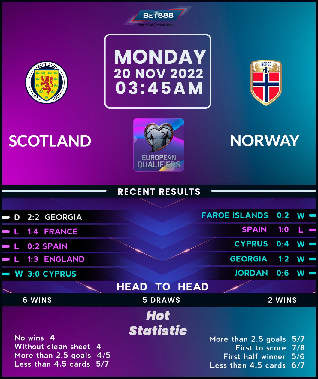 Having ended a 24-year absence from the Euro finals in 2020, Scotland are bracing themselves for back-to-back appearances at the tournament after securing qualification with games to spare. But complacency seems to have got the better of Steve Clarke’s men as they’ve gone winless in four consecutive internationals since getting the job done in Group A (D1, L3), including a goal-glutted 2-2 draw against Georgia in midweek. With injured captain Andy Robertson, Scotland’s defensive woes have come to the fore, with the ‘Tartan Army’ conceding 2+ goals in four consecutive outings in the build-up to this encounter, having registered four clean sheets in five prior matches. If it’s any consolation, they’ve won their last two meetings with Norway by a single-goal margin.