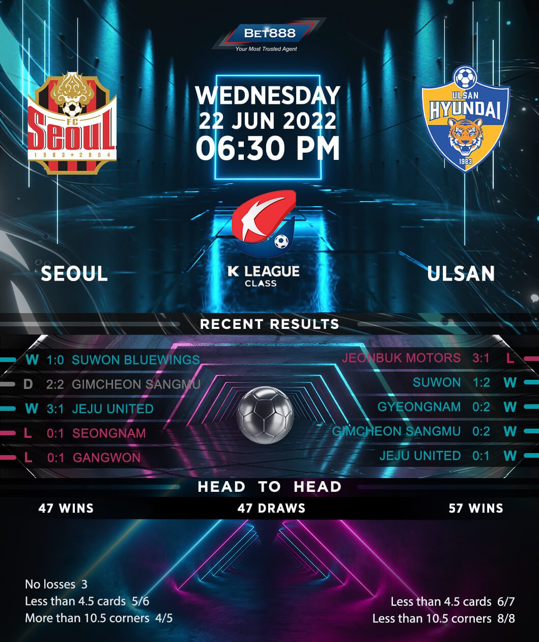 Seoul eked out a narrow 1-0 win away to Suwon Bluewings last time out to arrest a frustrating streak of three winless K League 1 matches (D1, L2). However, they can ill-afford to rest on their laurels, as they still trail the playoff zone by a point. Homecoming Seoul will hope to defy their indifferent home league record this term (W3, D2, L2) and return to winning ways after going winless in back-to-back home outings (D1, L1). Unfortunately, Ulsan’s visit suggests another lacklustre result could be on the cards, with Seoul failing to win any of their last six top-flight H2Hs on home turf (D3, L3).