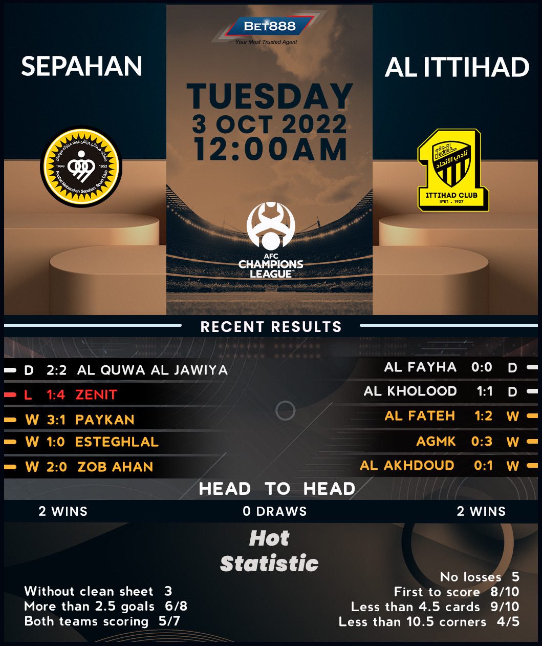 Sepahan’s Group C journey began with a goal-glutted 2-2 draw against Al Quwa Al Jawiya as they turned the game on its head after conceding an early goal, only to relinquish that lead in the 88th minute. A lack of match fitness may prove a problem for the ‘Yellow Storm,’ given that the draw against their neighbors remains their only competitive outing since the beginning of September, casting doubt on their capacity to fend off star-studded Al-Ittihad. But Sepahan can draw confidence from going unbeaten in seven competitive home games since the start of March (W6, D1), registering four clean sheets across their last six contests at the Naghsh-e-Jahan Stadium.