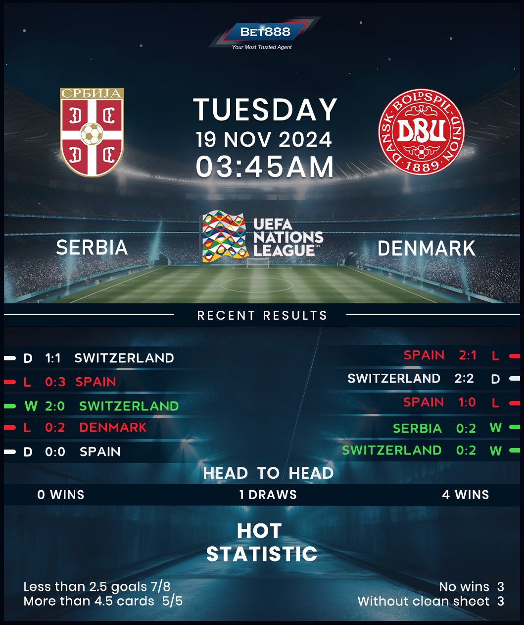 Serbia recovered from a disastrous 3-0 defeat at Spain to hold Switzerland to a nail-biting 1-1 draw last week and ensure they remain in Division A after securing a maiden top-flight promotion in the previous Nations League cycle. However, Dragan Stojkovic cannot be proud of his team’s form, with a 2-0 home victory against the Swiss remaining Serbia’s only win since the start of their ill-fated Euro 2024 campaign (D4, L3). Despite such a dreadful patch, beating Denmark in Group A4’s finale would see them qualify for the quarter-finals against the odds. Serbia’s four-game unbeaten home streak on home soil (W2, D2), including a 0-0 draw against European champions Spain in round one, can inspire confidence around Stojkovic’s camp.