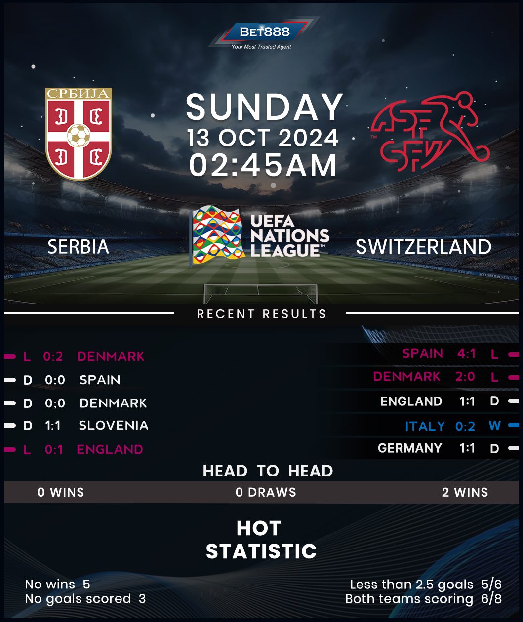On the other hand, Switzerland’s fourth consecutive League A campaign has been off to a humiliating start as they lost both Group A4 encounters against Spain and Denmark via multi-goal margins, conceding precisely two second-half goals each time. The upcoming trip to Leskovac bodes well for the Swiss’ bid to bounce back, considering their 100% win ratio against Serbia (W2), though both previous H2H triumphs came by a single-goal margin. But like their hosts, Murat Yakin’s men have struggled in the front third lately, bagging just one goal across their last four internationals (W1, D1, L2). That’s an ominous trend for the Swiss side bidding to defy a dismal record of one win from their last eight Nations League travels (D1, L6).