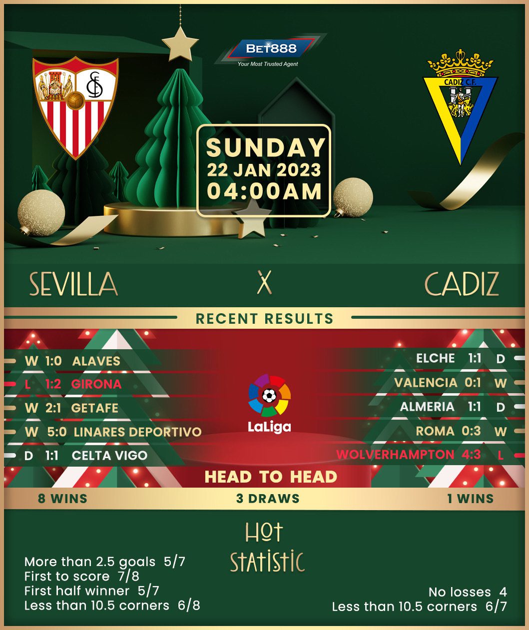 Sevilla spurned a 1-0 halftime advantage in a disappointing 2-1 defeat at Girona last weekend, falling back into the La Liga drop zone, two points adrift of 17th-placed Real Valladolid. With only 15 points to their name after the first 17 La Liga rounds, they are experiencing their worst top-flight start since 1999/00. Jorge Sampaoli’s men have picked up just one victory in their eight previous league outings (D3, L4), but a 1-0 Copa del Rey win at Deportivo Alaves in midweek could inspire their top-flight resurgence. Adding to this sentiment, ‘Los Rojiblancos’ haven’t lost any of their last ten La Liga encounters against Cadiz (W5, D5), though they could only manage a 1-1 draw in this corresponding fixture in 2021/22.