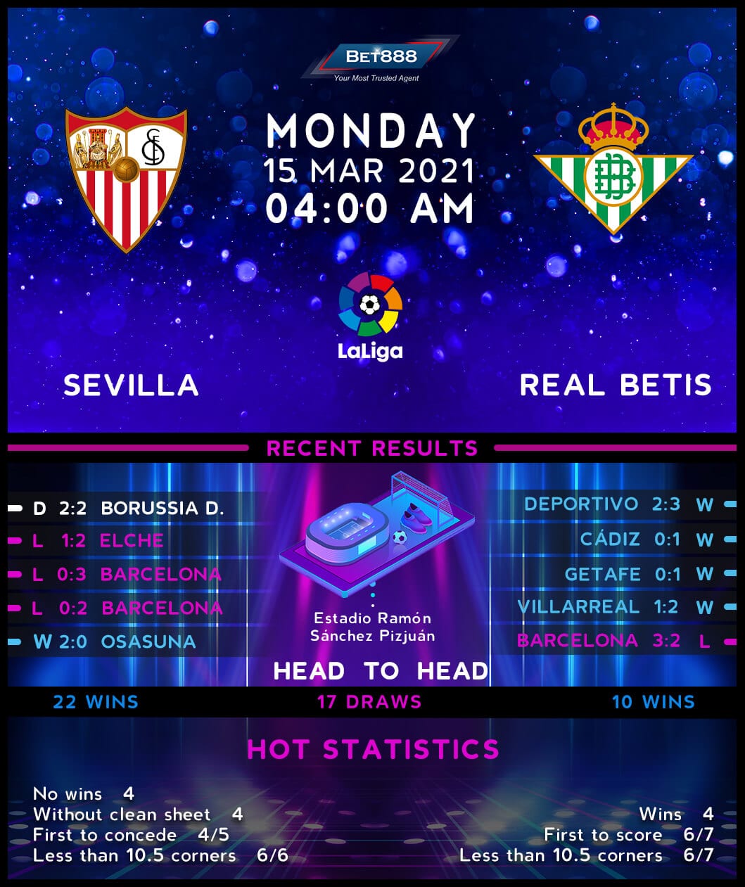 Estadio Ramón Sánchez Pizjuán is the venue as Sevilla and Real Betis go head-to-head in the 100th Sevillian derby in LaLiga. Sevilla lead the all-time H2H record, having won 46 such meetings compared to Betis’ 30 victories (D23).