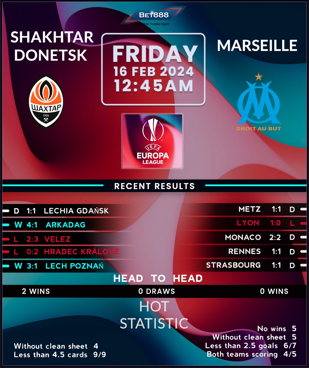 Shakhtar Donetsk’s dismal Champions League group stage campaign proved they’re terminally unable to secure springtime fixtures at Europe’s top table after a sixth consecutive failed attempt to reach the knockouts. Demoted to the Europa League knockout playoff round for the second season on the trot, the Ukrainians are keen to replicate last season’s success when they ousted Marseille’s fellow Ligue 1 rivals Rennes. Despite still playing their ‘home’ matches in Germany, the ‘Miners’ are traditionally formidable hosts, as evidenced by their decent-looking eight-game home form in continental action (W3, D3, L2). Moreover, they’ve usually excelled against French visitors, losing just one of the nine previous European clashes against Ligue 1 sides they’ve hosted (W4, D4, L1).
