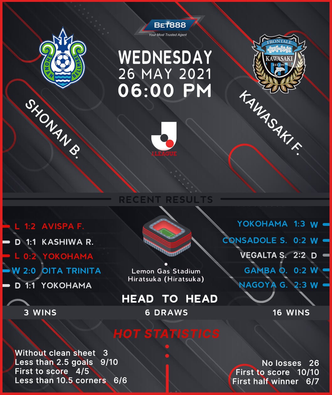 Shonan Bellmare and Kawasaki Frontale will lock horns at the Lemon Gas Stadium in what should be a routine task for the defending J1 League champions.