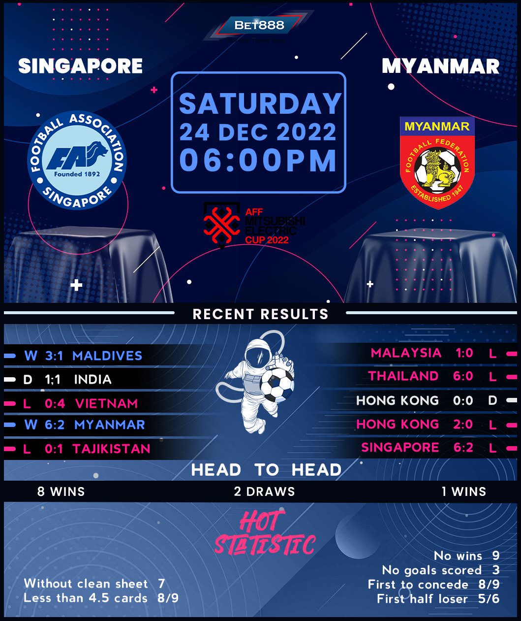 Despite delivering a mixed bag of performances during their three warm-up fixtures ahead of the tournament (W1, D1, L1), Singapore will take the field in high spirits, knowing they dismantled Myanmar 6-2 in their Asian Cup qualifier back in June. Unfortunately for the ‘Lions,’ that stunning victory was insufficient to help them navigate the third-round qualifying, casting doubt on their ability to perform at major tournaments. But Singapore reached the AFF Championship semifinals in the 2020 edition following three consecutive group-stage exits and will be looking to at least replicate that feat this time. Beating Myanmar would be a perfect start. And after defeating them via at least a three-goal margin in both previous H2Hs, there’s plenty of reason for optimism in Takayuki Nishigaya’s corner.