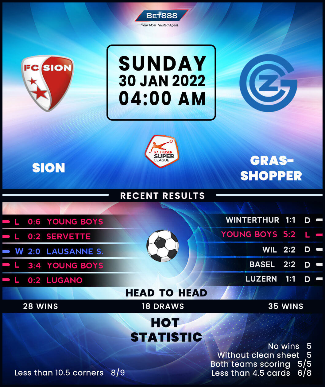 A brace of morale-crushing friendly defeats to Young Boys and Servette by an aggregate score of 8-0 in the warm-up campaign are discouraging as Sion look to overcome domestic wobble. The hosts cruised to a 2-0 home win over Lausanne to close 2021 out on a high, ending a run of two consecutive league losses. Interestingly, since being held to a 1-1 home draw to Luzern in September, none of Sion’s last 11 top-flight matches have ended level (W4, L7), 55% of which featured a full-time margin of 2+ goals. But Paolo Tramezzani’s men can draw confidence from their uplift in home form, having gone from four consecutive home league outings without winning (D1, L3) to back-to-back triumphs by a two-goal margin. With four of Sion’s five goals scored across those two wins coming beyond half-time, Grasshopper should be worried about their second-half display.