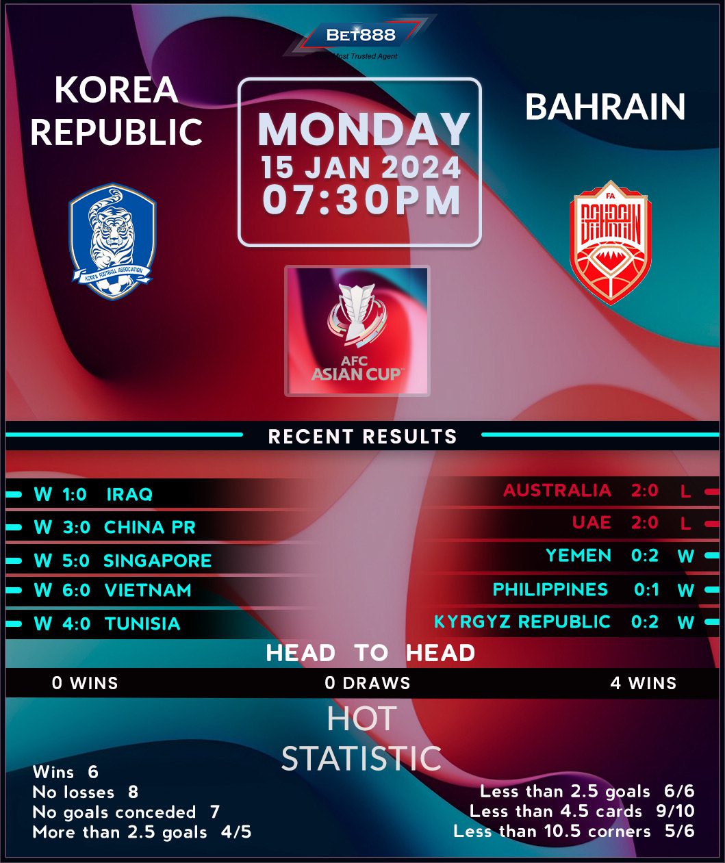 South Korea’s pursuit of their first Asian Cup title since 1960 begins against a foe they last defeated in the previous tournament, running out 2-1 extra-time victors in the round of 16. The ‘Taegeuk Warriors’ come into proceedings in high spirits after winning six internationals on the spin. What’s more impressive, each of those six victories saw Jurgen Klinsmann’s side keep a clean sheet, with four yielding 3+ goal margins. That run includes a pair of thumping wins against Singapore and China at the start of their 2026 World Cup qualifying campaign, both of which witnessed the Koreans get on the scoresheet on either side of halftime.