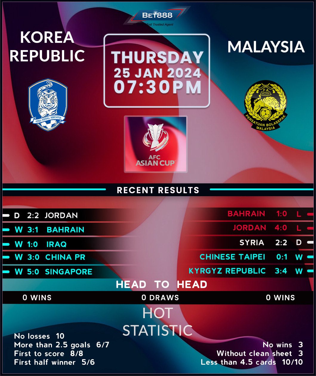 South Korea’s pursuit of Asian Cup glory for the first time since 1960 was off to a flying start, with the ‘Taegeuk Warriors’ thumping minnows Bahrain in their curtain-raising E fixture. Despite heading into their round-two clash against Jordan as clear-cut favorites to seal a top-place finish with a game to spare, Jurgen Klinsmann’s side spurned an early lead in a goal-glutted 2-2 draw and now must outscore them to ascend to the top. It shouldn’t be a tall order, though, considering they’ve been firing on all cylinders, netting 3+ goals in five of their last seven outings. Moreover, they’ve won their three most recent encounters against Malaysia via 2+ goals ‘to nil,’ though it’s worth noting their last meeting dates back to 1989.