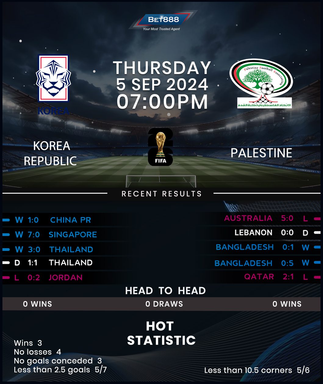 South Korea’s pursuit of their 11th consecutive World Cup qualification is firmly on track after Hong Myung-bo’s side strolled to a top-table Group C finish in the second stage, dropping points just once in six matches (W5, D1). Defensive solidity carried the Koreans through phase two as they conceded just once. Meanwhile, their free-firing frontline bagged 20 goals, suggesting their first-ever encounter against Palestine could be one-way traffic. However, the Taegeuk Warriors shouldn’t get ahead of themselves after failing to score more than one goal in three of their last five home outings, friendlies included. Yet, anything other than South Korea’s triumph in this match-up would be an epic surprise, especially considering they’ve not lost to Asian opposition on home turf for over three years.