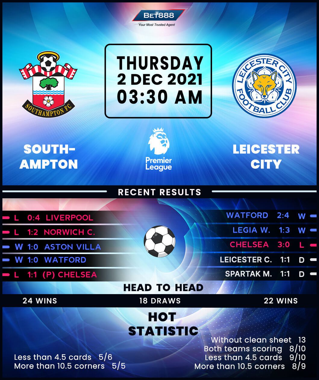 As for Leicester, a comprehensive 4-2 win over newly-promoted Watford at the weekend saw them snap an underwhelming three-game winless Premier League run (D1, L2). However, Brendan Rodgers’ men have blown hot and cold away from home this season, as evidenced by their indifferent form across six top-flight travels so far (W2, D2, L2). Unlike Southampton, the ‘Foxes’ have been fun to watch this term, with each of their six Premier League away games seeing both teams score while five of them producing 3+ overall goals. What’s more, Leicester have racked up three victories across their last four league visits to Southampton (D1), netting an average of 4.0 goals per game in the process. Curiously, that’s as many wins as they had in their previous 38 league matches at St Mary’s Stadium (W3, D14, L21).