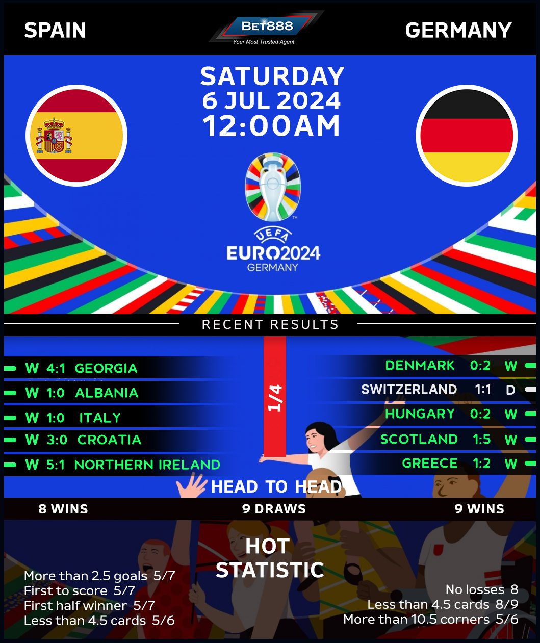 On the other hand, except for a 1-1 draw against Austria on Matchday 3, the Germans boast a faultless record at Euro 2024, having won the other three outings by a combined score of 9-1, most recently dispatching Denmark 2-0 in the opening knockout round. Julian Naglesmann’s men came out on top of a nail-biting contest marred by a VAR controversy to set up their first quarter-final appearances at the Euros since 2016. Riding on an eye-catching eight-game unbeaten run (W6, D2), Die Mannschaft bid to take advantage of playing on home turf to end a 28-year title drought at the grandest continental stage. Worryingly for the Germans, they’ve won none of their last four meetings with Spain (D3, L1).