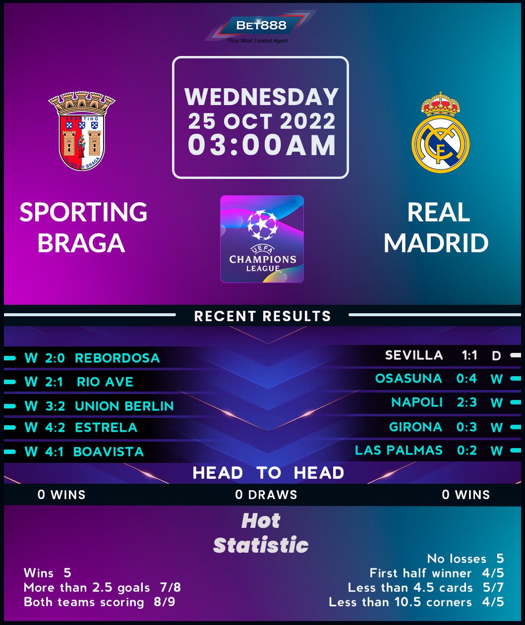 Sporting Braga pulled off an outrageous comeback at Union Berlin last time out, bouncing back from an early 2-0 deficit to win 3-2 on German soil. That result forms part of their impressive five-match winning streak across all competitions, which kickstarted with a 4-1 thumping of Boavista at home immediately after going down 2-1 to Napoli in their Champions League opener. The Primeira Liga heavyweights have already equaled their wins tally from their previous Champions League campaign in 2012/13 (W1, L5). Artur Jorge’s side excelled at home in qualifying, beating TSC Backa Topola 3-0 and Panathinaikos 2-1, making for good reading ahead of their first home encounter against Spanish visitors since a 1-0 victory over Sevilla in the Champions League playoffs back in August 2010.