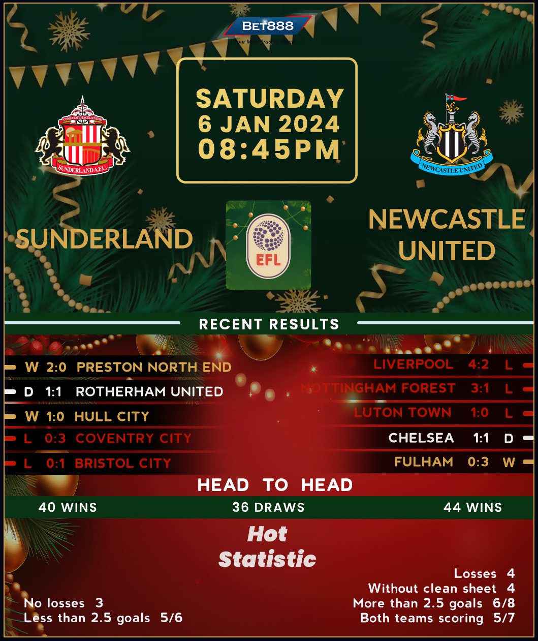 Sunderland enjoyed a scintillating start to 2024, scoring two unanswered first-half goals en route to toppling Preston North End 2-0 on home turf. New manager Michael Beale has seemingly overcome a rough start to his tenure, guiding the ‘Black Cats’ to three straight unbeaten matches (W2, D1) following a 3-0 demolition at the hands of Coventry on his touchline debut. Sunderland’s form resurgence bolsters their bid to maintain an eye-catching nien-game unbeaten H2H run against Newcastle (W6, D3), which includes three consecutive wins at home. Extending that streak would see Sunderland set a new club record for the most successive home triumphs against Newcastle. However, that’s easier said than done despite the visiting side’s long-standing injury crisis.