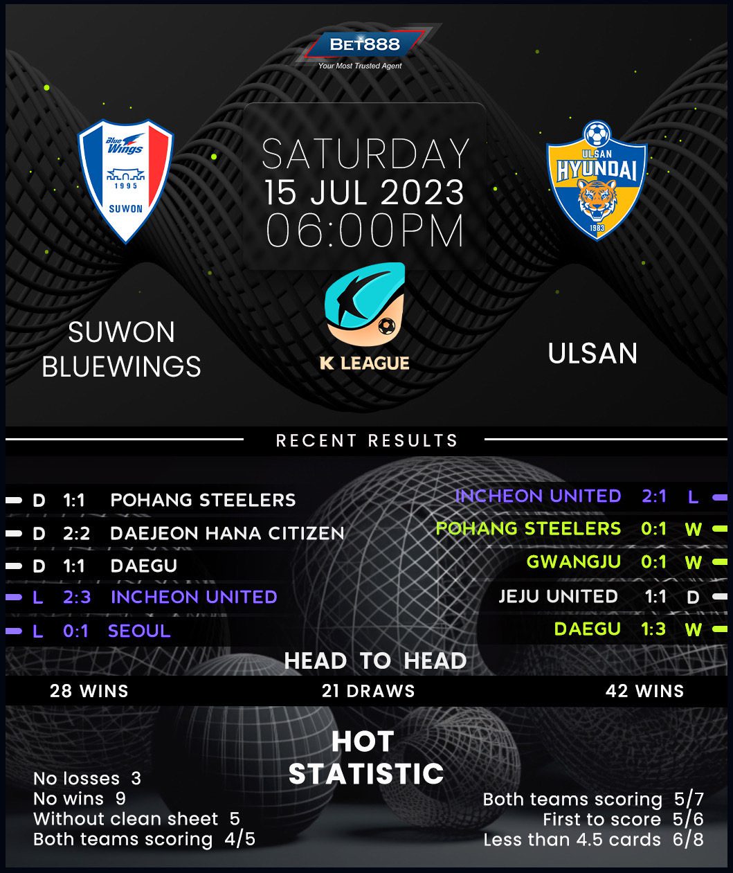 On the other hand, Ulsan Hyundai struck home a stoppage-time equalizer but still ended up on the receiving end of a 2-1 scoreline against Incheon United in midweek K League 1 action, seeing their five-match winning league streak run out of the window. Playing on hostile turf for a change could be a welcoming distraction, given the visitors have emerged victorious on their last three top-flight travels, including a brace of 1-0 wins in the build-up to this trip. But the Suwon World Cup Stadium hasn’t been a happy hunting ground for Ulsan by any stretch of the imagination, as they’ve drawn a blank in three of their last four league H2Hs against Suwon here (W1, D1, L2).