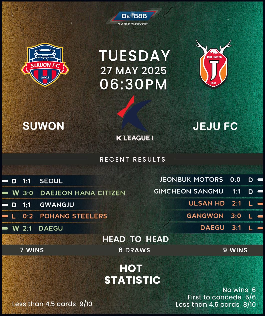 Suwon recovered from a halftime deficit in a 1-1 draw at Seoul last weekend, though the result did little to improve their standing in the K League 1 table. With only three wins from the opening 15 rounds (D6, L6), the hosts languish in the lower reaches, trailing sixth-placed Gwangju by seven points before this midweek round. They’ll likely relish the upcoming home return after winning three of their last four league games at Suwon Sports Complex (L1), all of which saw them score at least two goals. Topically, they’ve won back-to-back home league H2Hs with Jeju, netting 2+ goals each time, having won none of their previous four on this ground (D2, L2).