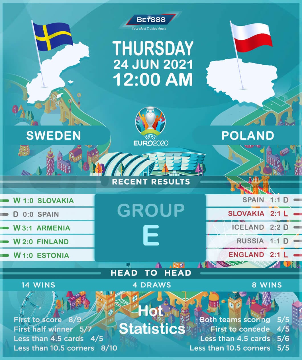 Meanwhile, Poland’s hopes of advancing to the round of 16 are hanging in the balance after they failed to win their opening two Euro 2020 fixtures (D1, L1). Both Poland’s games in Group E have seen them concede the opening goal by the 25th minute and pull one back inside the first ten minutes of the second half. The Poles can find a glimmer of hope knowing they have won their final group stage game in both of their previous major tournament appearances. However, seven consecutive defeats in their competitive H2Hs against Sweden douse any embers of optimism ahead of this encounter. If they fail to overcome the Swedes, it will be the first time since Euro 2012 that the Poles haven’t won any of their three group stage games at a major tournament.