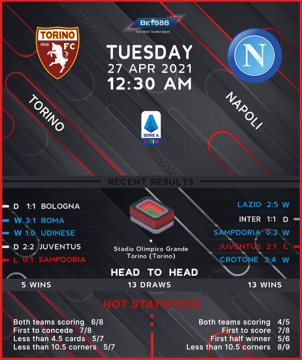 Stakes are high as relegation-threatened Torino welcome top-four challengers Napoli to the Stadio Olimpico di Torino in an exciting Serie A fixture.