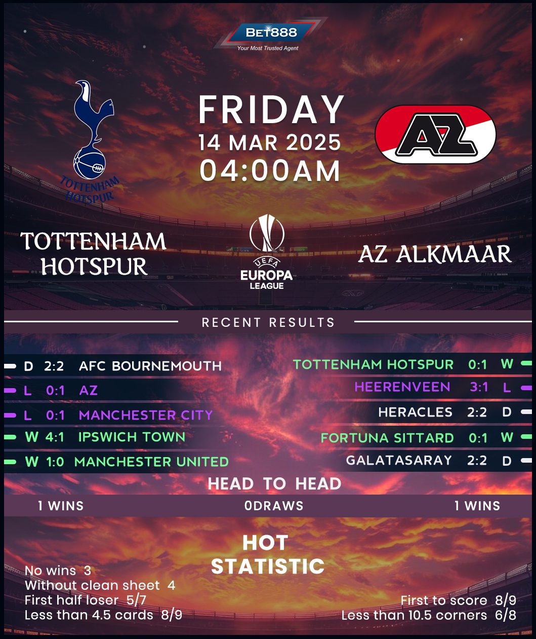 On the other hand, AZ Alkmaar wasted a catalog of chances in the first leg but still maintained their phenomenal run to seven wins from their last nine competitive matches (D1, L1). Manager Maarten Martens lamented missed opportunities after the game, yet fresh legs could work in his side’s favor after the Dutch FA granted AZ a weekend off in league action. However, history is firmly against the visitors in this fixture, considering they have lost all nine previous UEFA visits to English clubs – the outright worst losing ratio in European football! One of those losses was a 1-0 defeat at Tottenham in this season’s league phase, which forms part of AZ’s dreadful ten-match winless away run in European competitions (D2, L8).