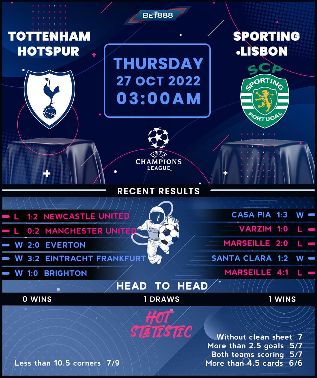 With only three points separating all four teams heading into the final two group stage matchdays, Tottenham will bank on their 100% home record in Group B (W2). Antonio Conte could enter ‘Spurs’ folklore by becoming the second-ever manager to win his first three Champions League home matches in charge of the ‘Lillywhites.’ Avenging a 2-0 defeat to Sporting in the reverse fixture tops the Italian’s assignment list after Newcastle United knocked his side down from a perfect seven-game home start in all competitions (W7) with a 2-1 victory at the weekend. Since the Londoners boast an eye-catching home European record against Portuguese visitors (W6, L1), qualifiers included, this should be Tottenham’s win every day of the week.