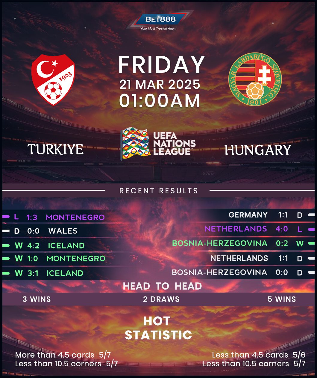 Turkey missed out on the second consecutive Nations League promotion by an inch as a disastrous 3-1 loss to Montenegro condemned them to this promotion/relegation playoff tie. That defeat marked Turkey’s first failure in six post-Euro 2024 matches (W3, D2) – three of which featured both teams on the scoresheet and 4+ goals. As the unseeded team in the draw, they host the first leg and can take heart from a decent-looking six-game unbeaten run on home soil (W4, D2) dating back to March 2023. However, Hungary’s visit could knock the Crescent Stars down from this run, considering they’ve won none of the last five H2Hs (D1, L4), losing both legs without scoring when the two nations shared the stage in the 2020/21 Nations League campaign.