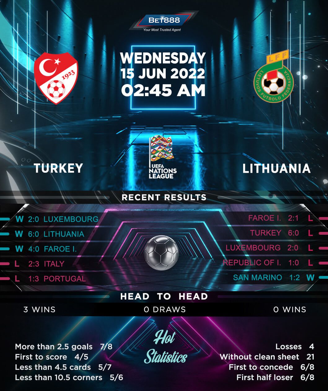 As for Lithuania, despite taking an early lead against te Faroe Islands last time out, they fell to a 2-1 defeat, extending their losing streak to four matches. Having lost all three Group B1 fixtures, the visitors are on the verge of suffering relegation to League C. Another defeat in Izmir may all but cement a bottom-place finish for the Lithuanians, who have lost nine of their ten away internationals since the start of 2021 (W1). Based on Lithuania’s woeful record in this competition, another reverse is on the cards. The ‘Rinktine’ have lost 11 of their 15 Nations League contets (W2, D2), highlighting their status as pre-match outsiders.