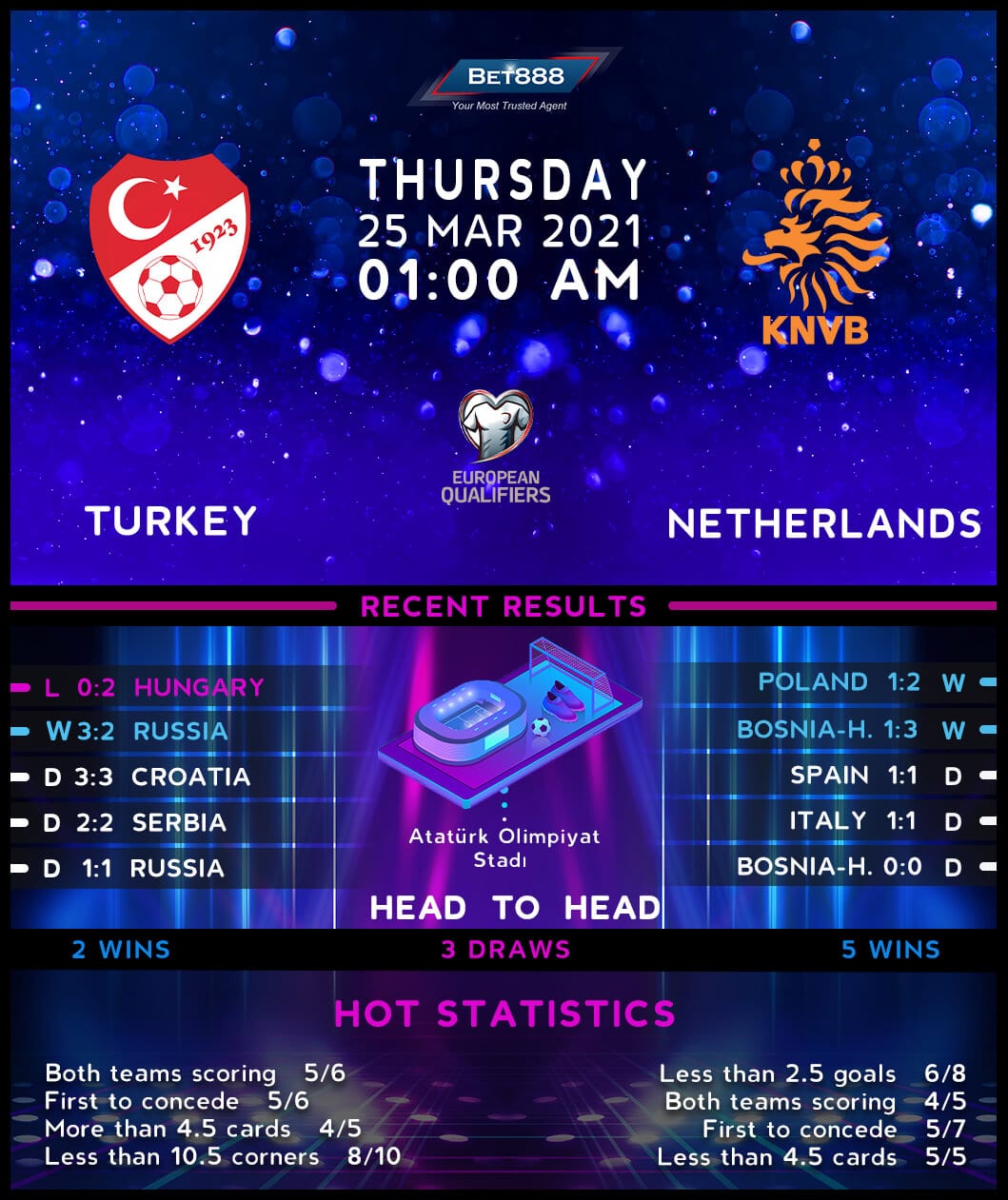 Meanwhile, Frank de Boer has been a catalyst to resurrect the fallen giants, with the Netherlands going unbeaten in all five games under the new coach (W2, D3) despite conceding first on three of those occasions. Though the visitors will aim to keep their undefeated run going, it is worth noting that they have failed to beat Turkey in both of their previous qualifying match-ups (D1, L1). On the flip side, however, the ‘Oranje’ have not lost 16 of their last 19 meetings with UEFA nations ranked within ten places of Turkey (W13, D3, L3), with 12 of those victories coming by at least a two-goal margin. Adding to their confidence, the Netherlands are unbeaten in their last ten away matches as betting favorites (W7, D3).