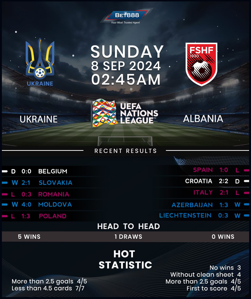 Despite suffering a morale-wracking group-stage exit at Euro 2024, even though they only lost once (W1, D1, L1), Ukraine should still take the field in high spirits. Forced to play on foreign turf due to a raging war in their country, Serhiy Rebrov’s men seek a positive Nations League start against an Albanian side they’ve never lost to across six previous H2Hs (W5, D1). The Ukrainians are no strangers to proceedings in League B, with this being their third campaign at this level, where they boast an eye-catching 80% unbeaten ratio (W6, D2, L2). On top of that, they’ve been dominant as a designated home side (W5, D2, L1), with the only blemish on this near-faultless run being a loss to three-time European champions Germany.