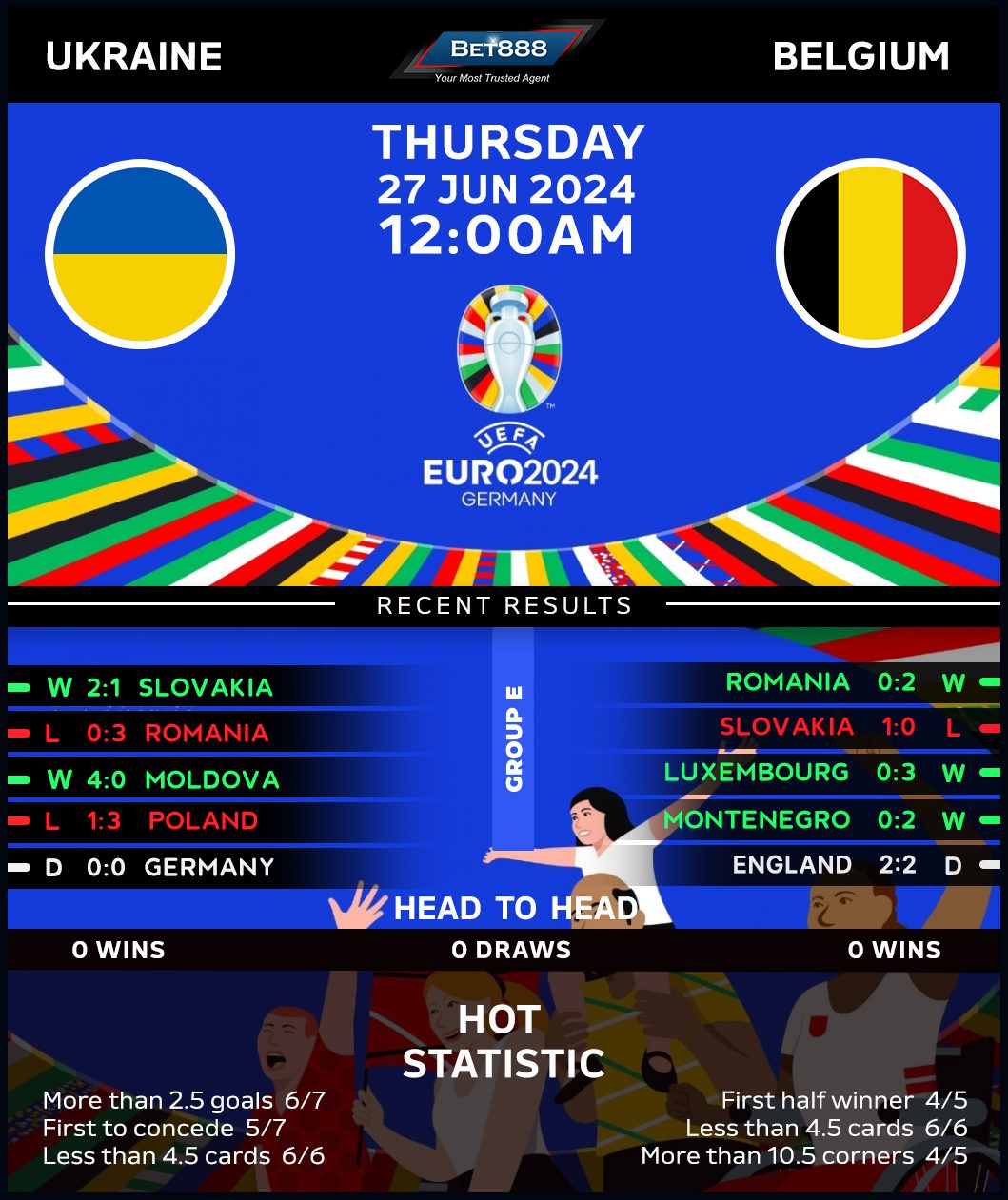 Ukraine’s ‘never give up’ mentality stunned Slovakia in round two as Serhiy Rebrov’s side fought back from an early deficit to win 2-1 and secure a fighting chance against Belgium following a dreadful 3-0 defeat to Romania in their opening Group E fixture. Accustomed to epic comebacks, the Ukrainians did the same in the March playoffs, overturning 1-0 deficits against Iceland and Bosnia to qualify for their fourth successive Euro finals. After posting their best result in the previous edition by reaching the quarter-finals, they’ll be out to upset the apple cart and take a vital three points against Belgium, a side they’ve never met before. However, alternating between victories (2) and defeats (2) across their last four internationals suggests the Ukraine supporters don’t know what version of their team would take the field in Stuttgart.