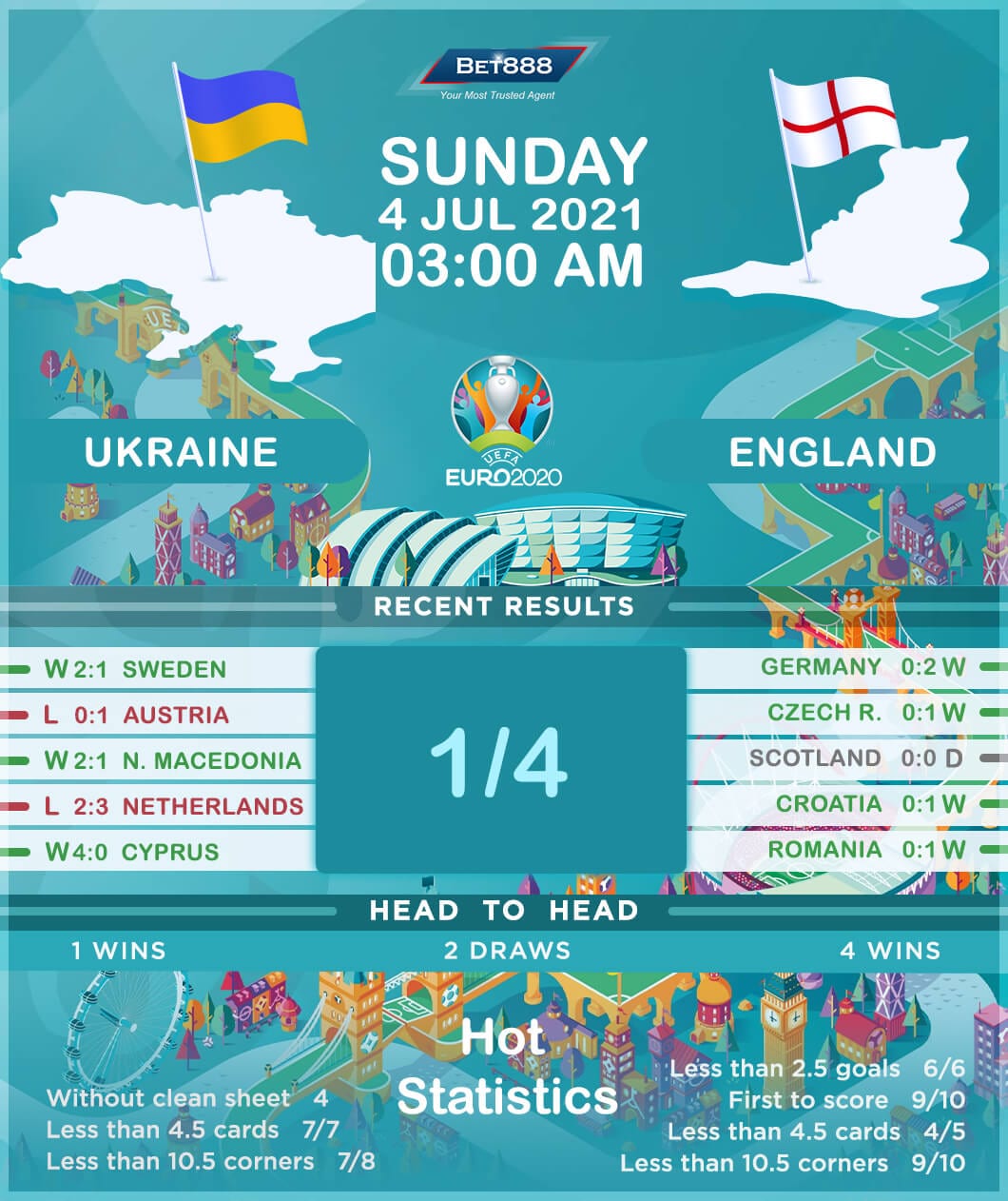 Artem Dovbyk’s last-gasp strike fired Ukraine past Sweden in the round of 16, helping them qualify for the quarter-finals in their first-ever European Championship knock-out appearance as a sovereign state. Interestingly, a 1-1 draw with Sweden marked Ukraine’s first Euro draw within regulation time. A hard-earned victory over the Swedes means the Ukrainians have picked up more wins (2) in their last three Euro matches than in their first seven in the competition combined (W1, L6). On the bright side, Andriy Shevchenko’s men have netted 2+ goals in all but one of their four outings at Euro 2020 so far, which hasn’t been the case in any of their previous seven encounters against England. Indeed, they have secured just one win in their seven meetings with this opposition (D2, L4), courtesy of a 1-0 triumph in a World Cup qualifier back in October 2009.