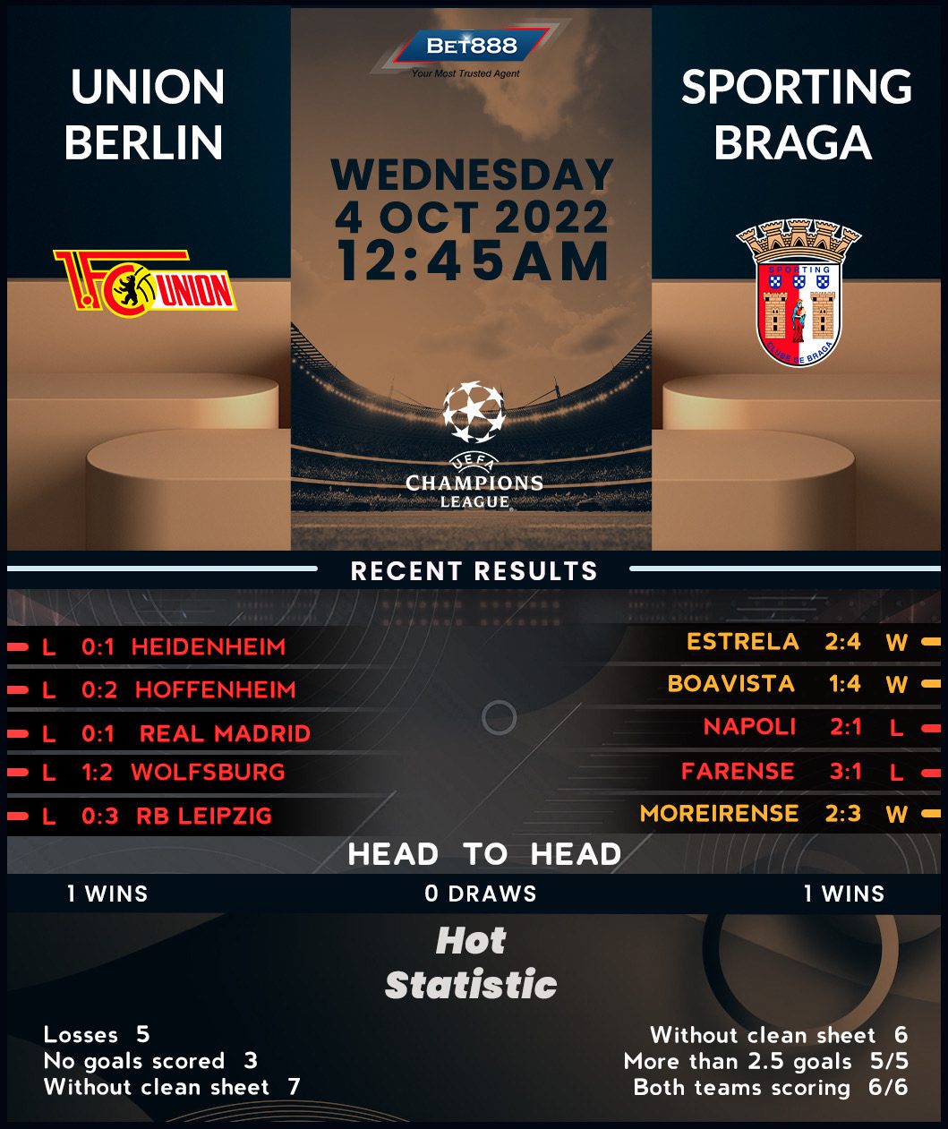 The two sides to have lost their opening Champions League games lock horns at the Olympiastadion as Union Berlin take on Sporting Braga in a bottom-table Group C encounter.
