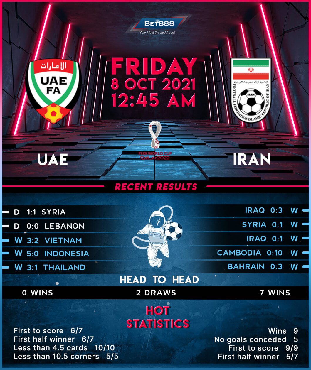 The United Arab Emirates’ blunt displays in their early Group A exchanges have resulted in back-to-back draws with the likes of sub-par Lebanon and Syria, both of which featured under 2.5 overall goals. However, the hosts remain unbeaten in nine international fixtures in 2021 (W6, D3), conceding under 1.5 goals eight times in the process. Before being held to a scoreless home draw to Lebanon last time out, the ‘Sons of Zayed’ had won five World Cup qualifiers on home soil in a row, netting an intimidating average of 3.4 goals per game in this run. That form should inspire the UAE’s hopes of posting their first World Cup qualifying victory over Iran at home at the fourth attempt (D1, L2), having drawn a blank in two of the last three.