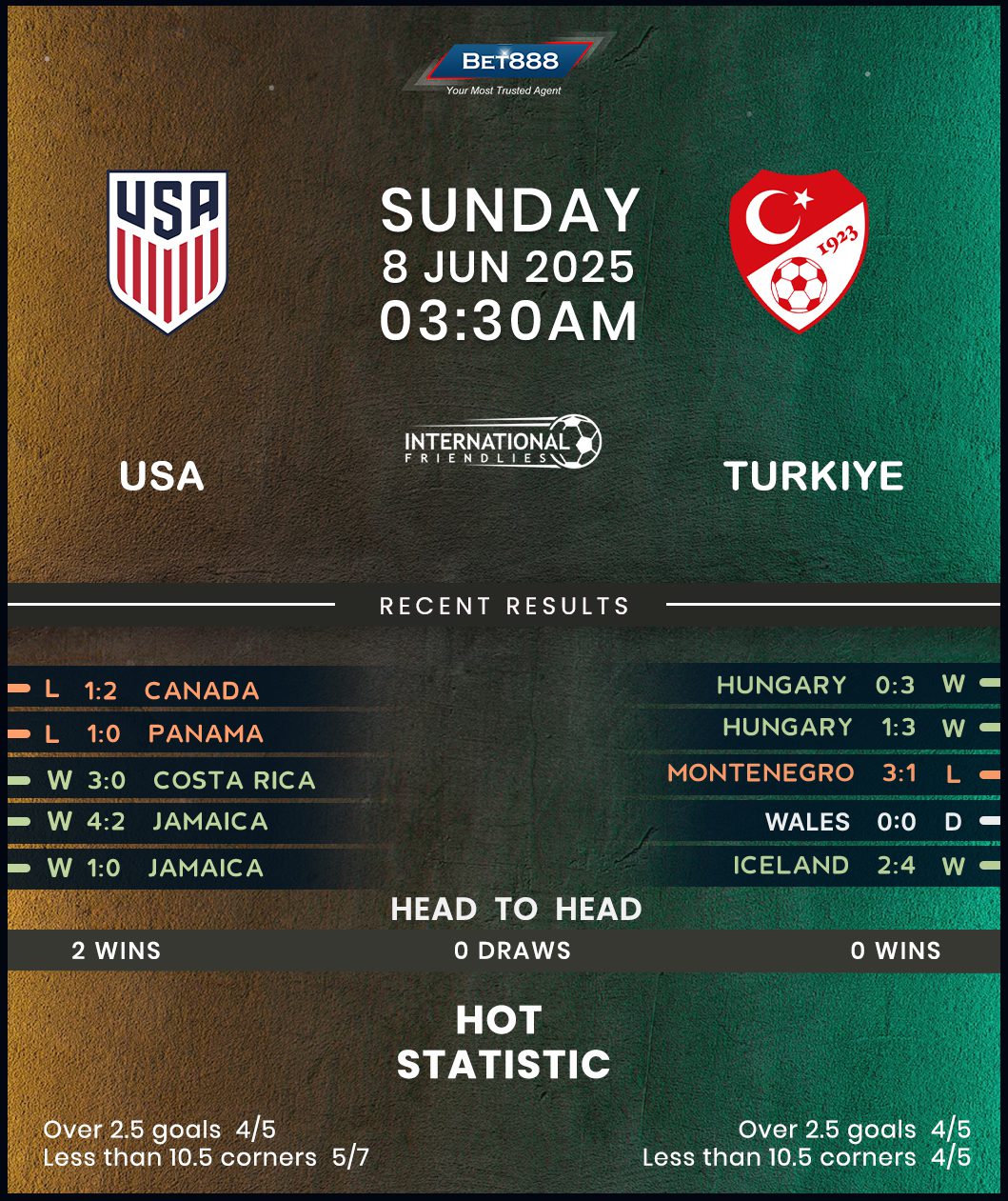 The United States enjoyed a fantastic start to 2025, dismantling Venezuela (3-1) and Costa Rica (3-0) in January friendlies. However, their form fell off a cliff in March, with Mauricio Pochettino’s side slumping to a brace of defeats to Panama (1-2) and Canada (0-1) in the CONCACAF Nations League. Keen to make amends and avoid losing three internationals on the spin for the first time since September 2024, the USMNT can take heart from beating Turkey in their last two H2Hs. However, the nations haven’t met since June 2014, rendering the H2H history meaningless. What counts is their impressive run of four victories from five home internationals since October 2024 (L1), all of which saw them score 2+ goals at an average of three per game!