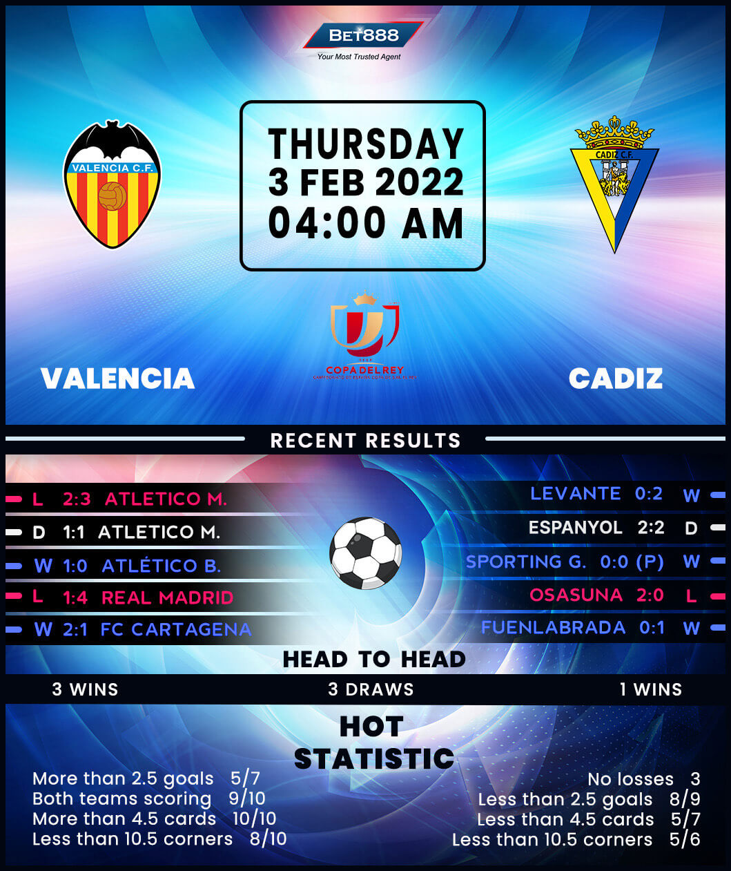Valencia will be desperate to bounce back from a heartbreaking 3-2 La Liga loss to Atletico Madrid when they meet a lowly Cadiz at the Estadio de Mestalla in their Copa del Rey quarter-finals tie.