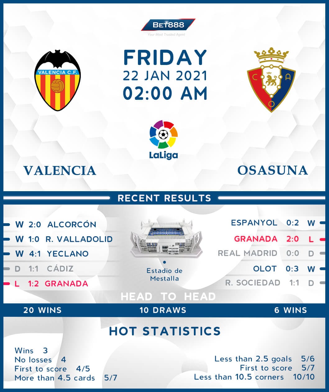 In-form Valencia entertain relegation-threatened Osasuna at the Estadio de Mestalla in a potentially high-scoring La Liga contest. Three of their last four top-flight fixtures have seen over 3.5 goals and both teams scoring.