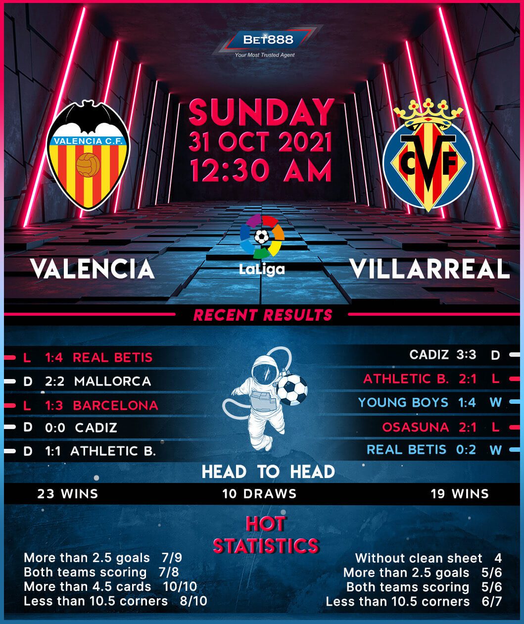 The latest edition of ‘Derbi de la Comunitat’ comes at the worst possible moment for Valencia, who take the field winless in seven straight La Liga matches (D3, L4), including a 4-1 thumping at the hands of Real Betis in midweek. Yet, ‘Los Murciélagos’ will call upon fond memories from their recent La Liga H2Hs at home, having defeated Villarreal in each of their last three league meetings at Mestalla. Jose Bordalas’ side netted 2+ goals in all of those three victories, which bodes well with their free-scoring home form this season. Indeed, Valencia have found the net in all five La Liga home matches so far, averaging 1.6 goals per match. Slightly more lethal after half-time, they’ve registered 62.5% of their La Liga home goals scored this term in the second half of play.