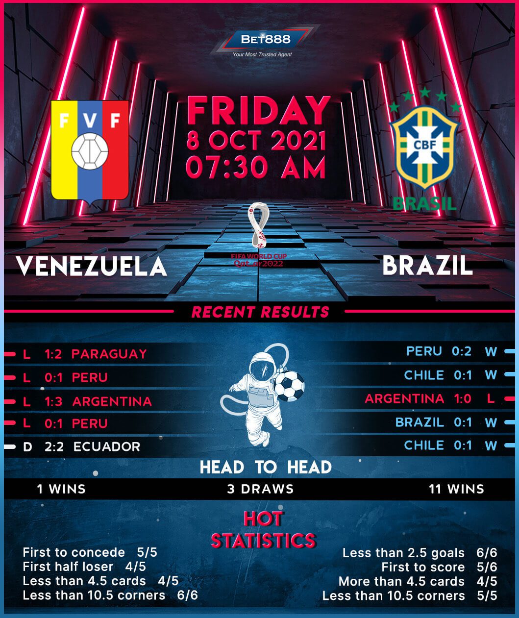 South American minnows Venezuela are well on course of failing to qualify for their first-ever World Cup finals, having returned just four points from nine World Cup qualifiers to date (W1, D1, L7). Nailed to the bottom of the South American World Cup qualification zone, the Venezuelans take the field as overwhelming outsiders after losing their last three World Cup qualifiers. What’s more, ‘La Vinotinto’ have suffered three consecutive defeats in their World Cup qualifying meetings with Brazil, drawing a blank in the last two in a row. Goals have been at a premium for Venezuela ahead of this encounter, with their five-goal tally remaining the lowest in the CONMEBOL’s World Cup qualifying group. But it’s worth noting that the majority (60%) of those strikes have arrived on home soil.