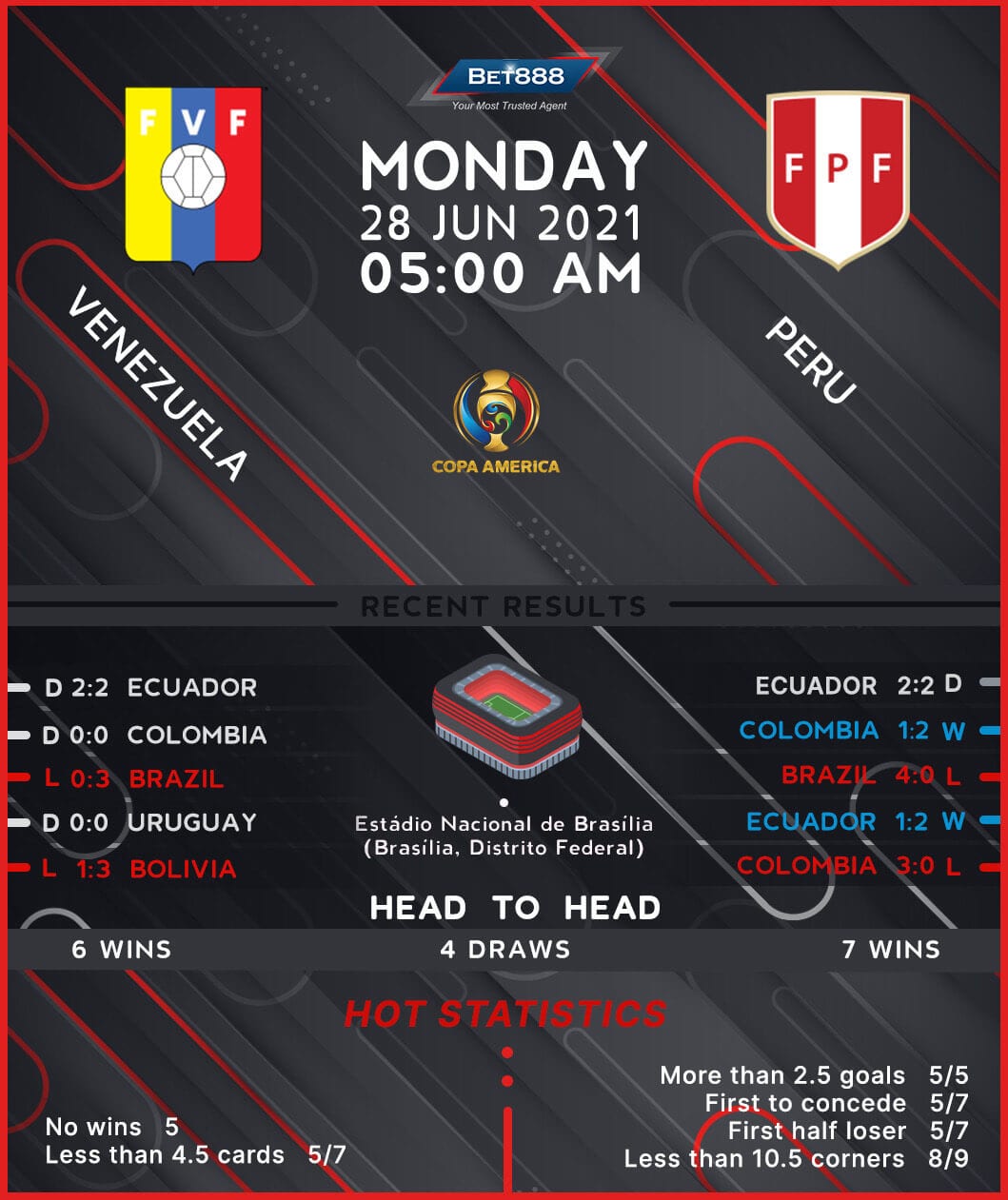 Venezuela’s hopes of securing qualification into the Copa America 2021 knock-out stages are at stake, as they take on Peru at the Estádio Nacional de Brasília.