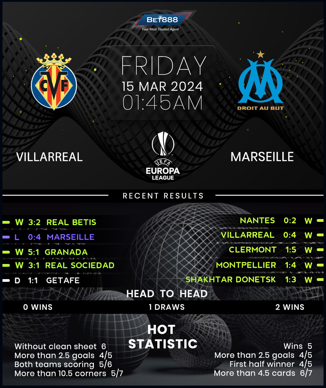 Villarreal’s embarrassing first-leg performance all but eliminated them from the Europa League last-16 after losing 4-0 at the Stade Velodrome. That defeat tipped the balance scale into the French sides’ favor in overall H2H stakes (W4, D2, L5), putting ‘El Submarino Amarillo’ in an almost impossible situation ahead of the rematch. Some confidence derives from Villarreal’s 1-0 home win against Ligue 1 side Rennes en route to topping Group F, though replicating that result wouldn’t be nearly enough to turn this tie on its head. But the Spaniards will at least be confident of avoiding another catastrophe after piecing together a five-game unbeaten run on home soil (W2, D3) and only losing once in their last eight European games in the province of Castellon (W5, D2).