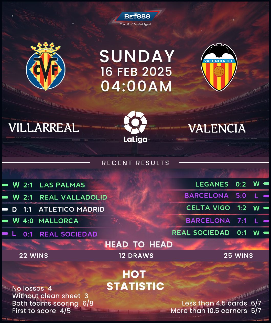 Villarreal strengthened their top-four pursuit last weekend with a hard-earned 2-1 victory at Las Palmas, giving themselves a chance to win three consecutive La Liga games for the first time since winning four in a row in March 2024. Interestingly, a narrow 1-0 home triumph against Valencia formed part of that sequence. It should set Villarreal up nicely for this must-win contest, as should their inspiring-looking run of four wins from their last six league outings (D1, L1). Adding to Marcelino Garcia Toral’s optimism, his charges have won back-to-back home league fixtures via an aggregate score of 9-1 after failing to win three such games on the spin beforehand (D2, L1). Furthermore, ‘El Submarino Amarillo’ emerged victorious from six of their last seven home league meetings with Valencia (D1).
