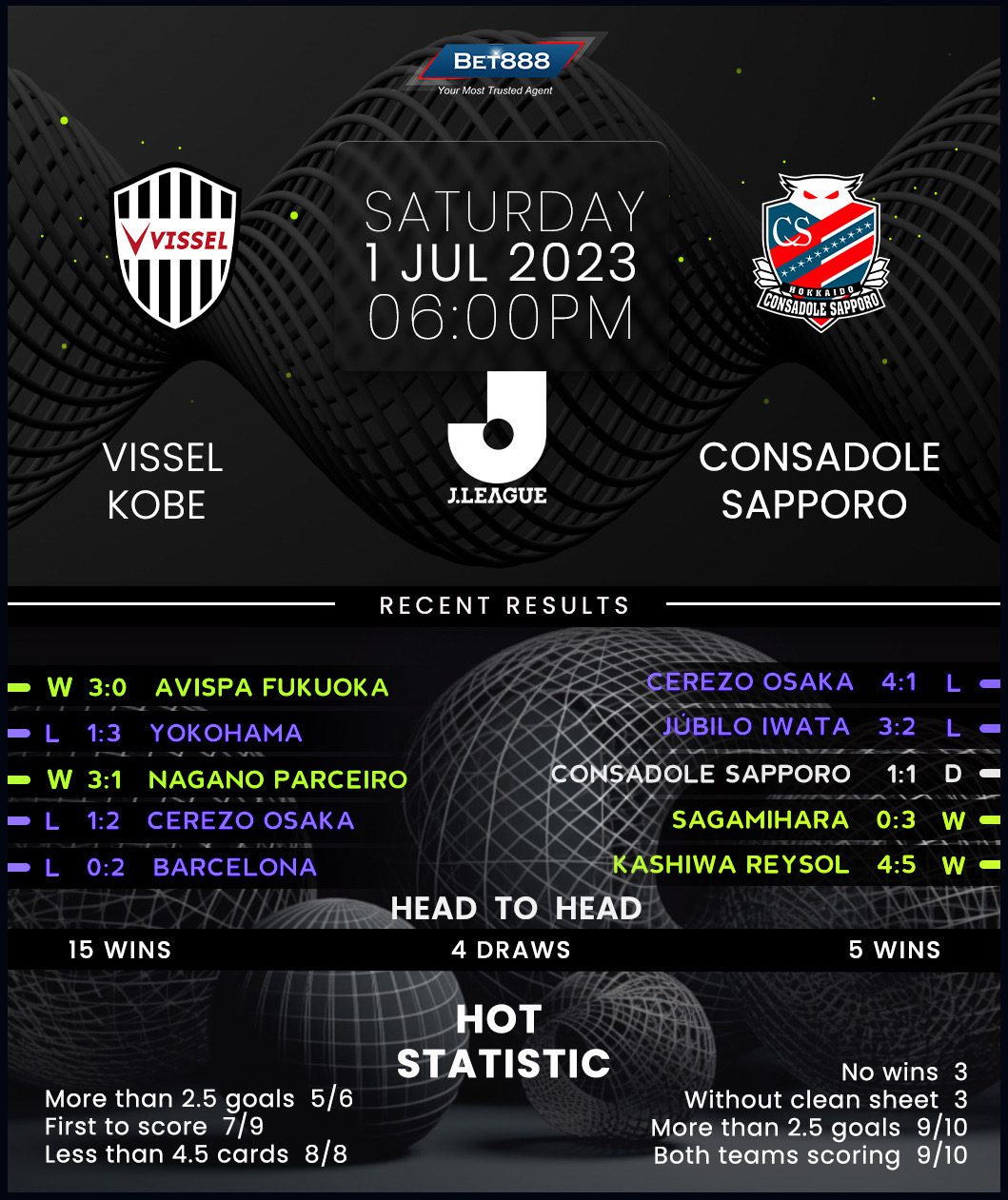 J1 League bidders Vissel Kobe entertain out-of-form Hokkaido Consadole Sapporo at the Noevir Stadium in an exciting league fixture.