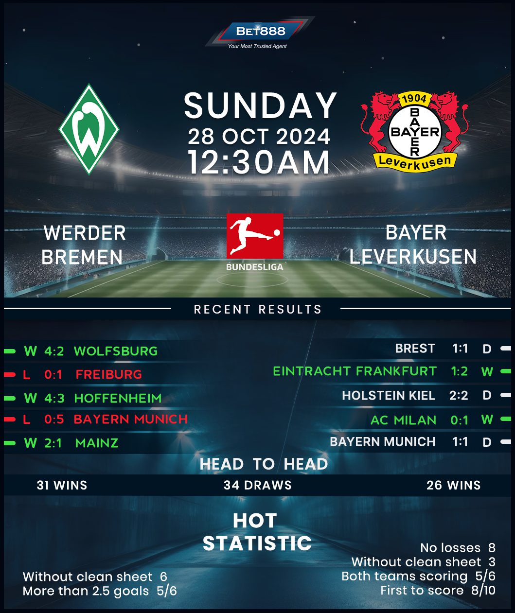 Werder Bremen delivered another astonishing away performance last weekend in a 4-2 thrashing of Wolfsburg, making it three consecutive Bundesliga wins on the road to move within a two-point distance of the top six pre-round. However, Ole Werner’s men have massively underperformed on home turf. Only one point from their first three home league outings this season (D1, L2) paints a bleak picture for the hosts, who have only won twice in their last ten top-flight matches at the Weserstadion (D3, L5). As if that disappointing stretch isn’t troubling enough, Werder Bremen are up against a Bayer Leverkusen side they have failed to beat in any of their last eight meetings in the Bundesliga (D4, L4), losing both H2Hs in 2023/24 by an aggregate score of 8-0.