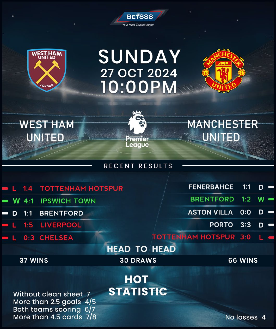 Another fired blank would see the Red Devils go three consecutive visits to West Ham without scoring for the first time in their league history. That would likely be a hammer blow for under-fire boss Erik ten Hag after his downtrodden side posted a third draw in as many UEFA Europa League games this season on their midweek trip to Fenerbahce (1-1). On a more promising note, Manchester United halted a three-game winless Premier League run (D2, L1) with a come-from-behind 2-1 home triumph against Brentford last weekend. Yet to win consecutive league games this season, the visitors head to London determined to end an underwhelming streak of four successive away draws across all competitions and potentially claw their way into the top half of the standings.