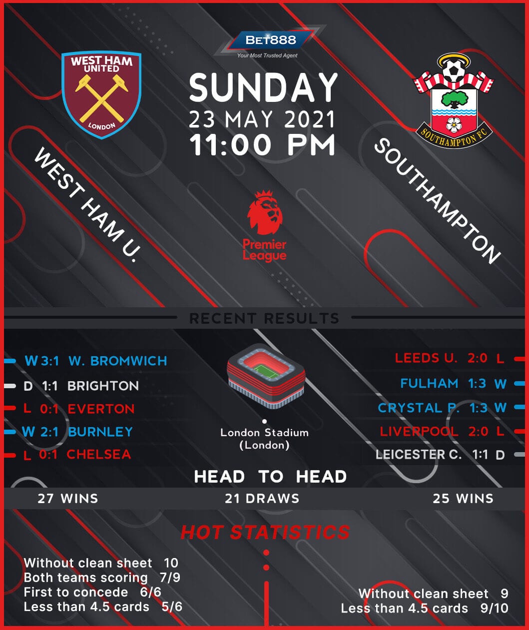 West Ham United and out-of-form Southampton are set to square off at the London Stadium in the final round of the 2020/21 Premier League campaign.