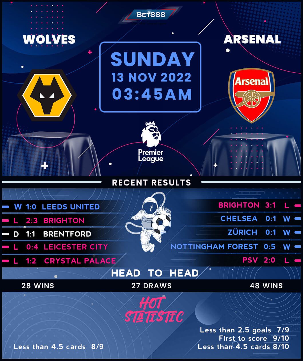 Newly-appointed Wolverhampton boss Julen Lopetegui will have to wait until after the Qatar showpiece to make his touchline debut in the Premier League due to a work permit. So it’ll be up to interim manager Steve Davis to inspire Wolves’ bid to bounce back from a dismal four-match winless league run (D1, L3). Not even a victory would secure the home side’s place outside the bottom three, but it’s a long shot anyway. The ‘Wanderers’ lost both last season’s Premier League clashes against Arsenal via a single-goal margin while only winning once in their eight top-flight outings preceding this encounter (D1, L6). While Wolves’ two Premier League victories this term have arrived at Molineux, it’s worth noting that each came against sides starting the round in the relegation zone.