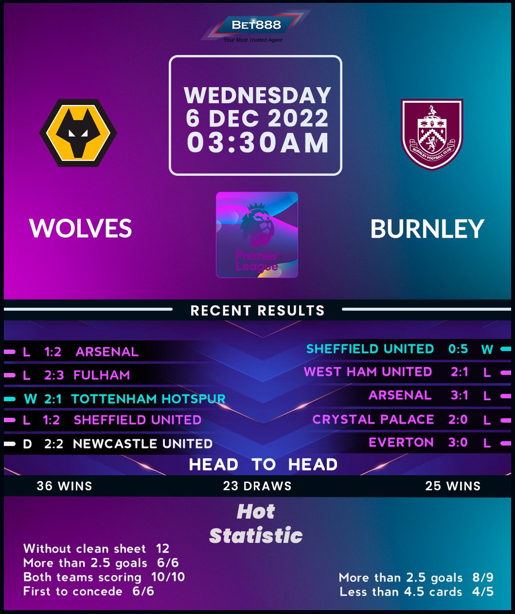 Back to Molineux following a 2-1 defeat to Arsenal at the weekend, Wolves are looking to reignite their Premier League form having lost three of their last five games (W1, D1). Manager Gary O’Neil can draw confidence from the fact all three losses came on the road, with his side stitching together a four-match unbeaten home league run (W2, D2), bookended by a stunning 2-1 comeback win against Tottenham last time out. However, after winning their first two Premier League H2Hs at home in the 21st century ‘to nil,’ the ‘Wanderers’ have gone winless in their last three on the trot (D2, L1), failing to get on the scoresheet in the most recent two. Home and away, they’ve not defeated Burnley in seven consecutive top-flight H2Hs (D3, L4).