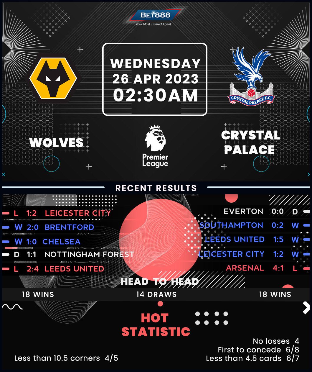 Wolverhampton wasted a 1-0 lead at Leicester City at the weekend, going down 2-1 at the King Power Stadium to end a three-match unbeaten run in the Premier League (W2, D1), throwing their survival hopes back into doubt. Julen Lopetegui’s men sit six points clear of the drop zone ahead of their impending return to Molineux, where they’ve racked up three victories in their last four league outings (L1). After dispatching Brentford and Chelsea ‘to nil,’ the ‘Wanderers’ could win three straight home matches in the Premier League for the first time since November 2021. But Molineux hasn’t been a safe shelter for Wolves against Palace, considering they’ve suffered four defeats in their seven Premier League H2Hs at home (W3).